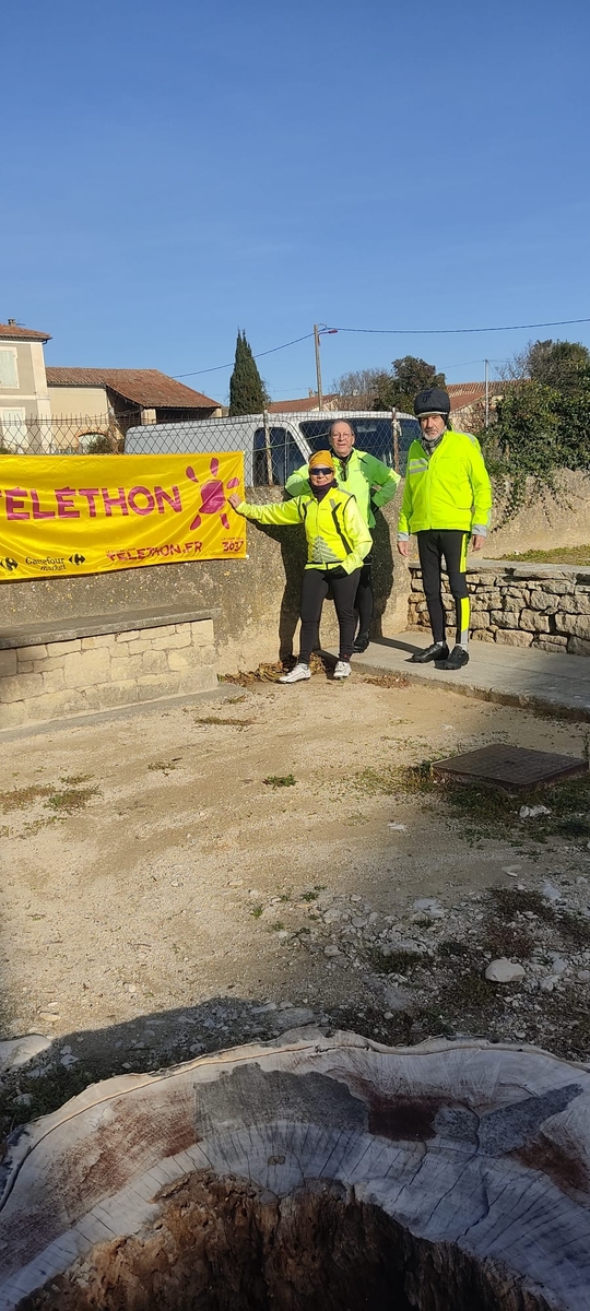 Participation de la roue d'or au Téléthon d'Aubignan, Martine Gérard et Pierre à vélo vers 14 heures et Jeannie et Georges, à pied un peu plus tard. Nous en avons profité pour faire un petit tour par Caromb, Beaumes de Venise, Vacqueyras et les garrigues. 39 kilometres avec la fraîcheur et le soleil.