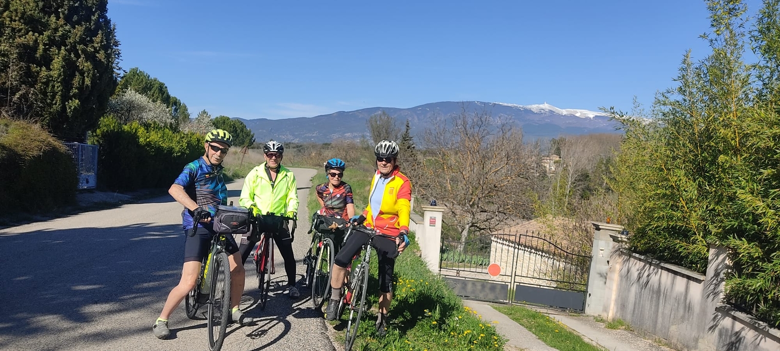 Martine, Jeannie, Georges, Michel et Pierre pour un circuit vers Mormoiron, Bedoin, Beaumes de Venise et Sarrians, environ 51 kilomètres et 460m D+, un peu plus pour Michel qui a continué vers Vacqueyras.