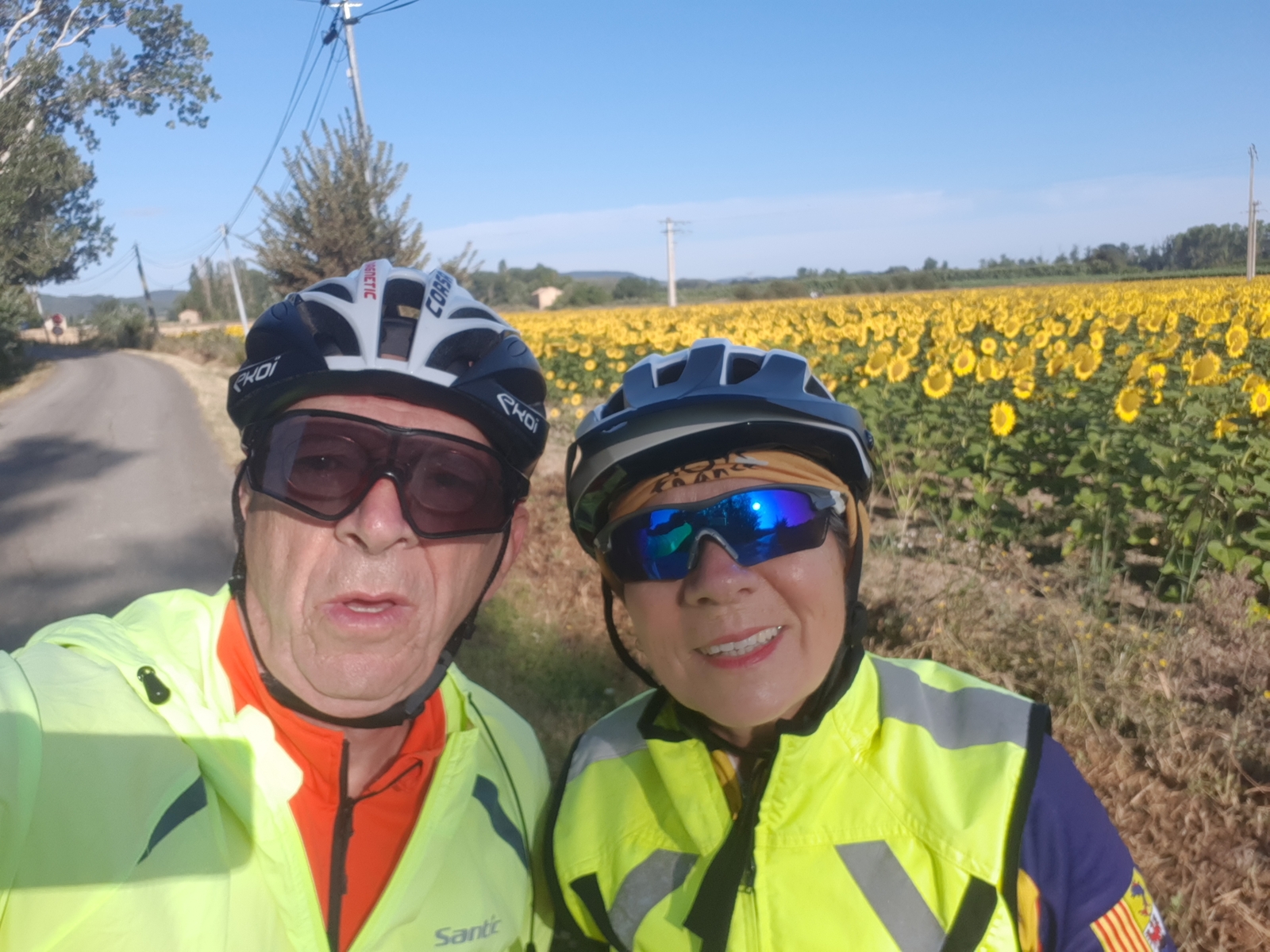 75 kilometres de plat pour Martine et Pierre, Jonquieres, Serignan, Piolenc, Via rhona, impossible de passer sous les ombrières car toujours en chantier et Via rhona barrée, Caderousse, Châteauneuf du pape, Courthézon et Sarrians par la via Venaissia.